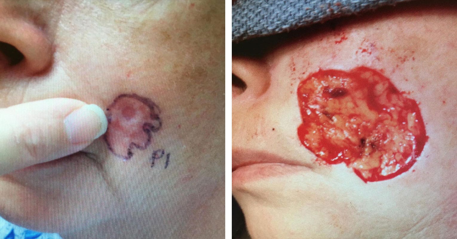 If skin cancer isn’t completely removed the first time, it often returns deeper and more aggressively, making future treatment much more challenging. Mohs surgery remains the gold standard for recurrent and complex skin cancers, offering the highest cure rate. By treating it right the first time with Dr. Wolfe, one of only twelve fellowship-trained Mohs surgeons in the entire panhandle of Florida, you minimize the risk of recurrence and avoid more invasive procedures later. The images below illustrate how skin cancers treated with less effective methods can recur more extensively, emphasizing why Mohs surgery is the top-recommended treatment for achieving complete, lasting removal.